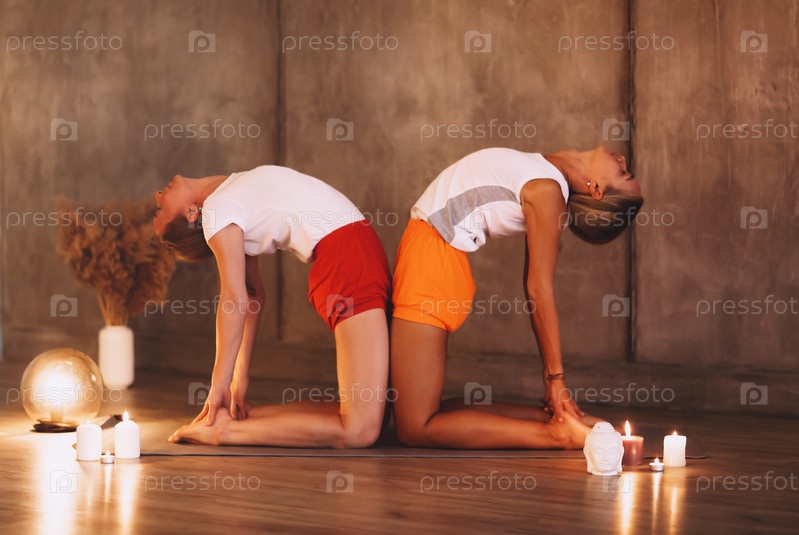 Две молодые стройные женщины в красочной спортивной одежде занимаются йогой в спортзале или студии