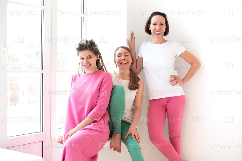 Три счастливые дамы отдыхают во время занятий йогой в спортзале, сидят на подоконнике солнечным утром