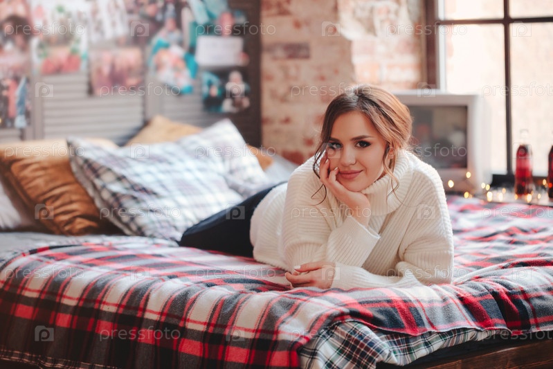 Молодая женщина отдыхает на кровати на фоне ретро-плакатов