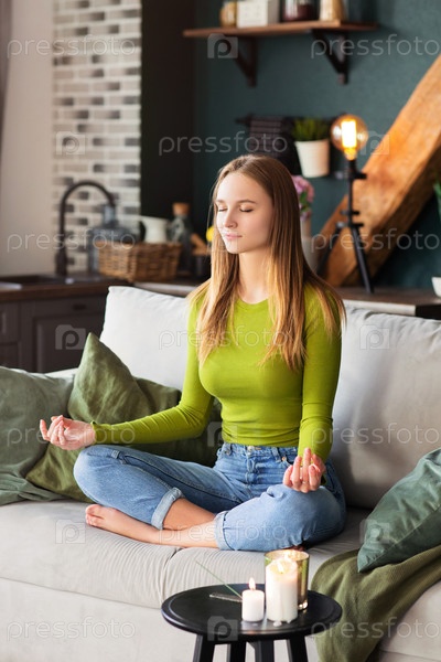 Блондинка медитирует в гостиной