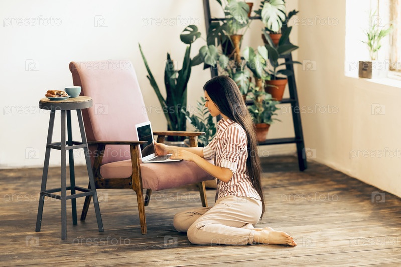 Женщина-фрилансер пьет кофе во время работы