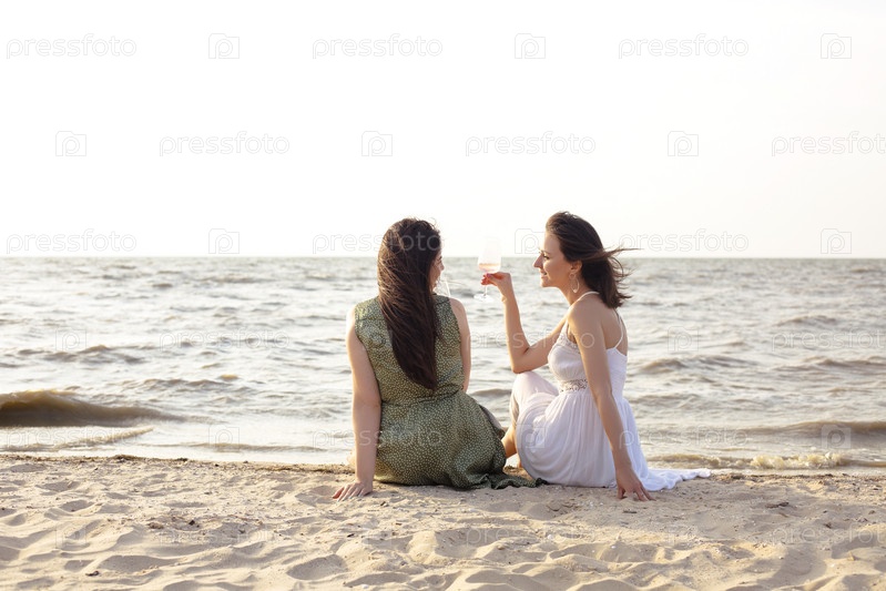 Счастливые взрослые женщины с вином отдыхают на пляже