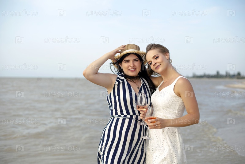 Счастливые взрослые женщины с вином отдыхают на пляже