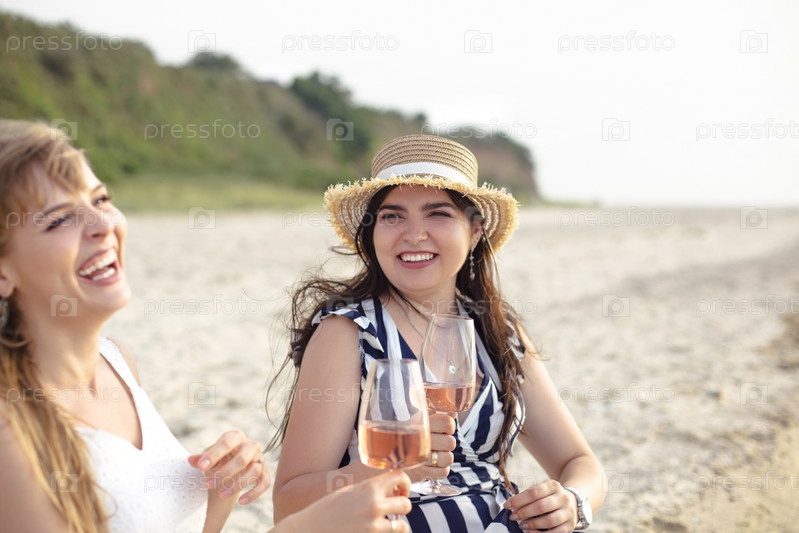 Счастливые взрослые женщины с вином отдыхают на пляже
