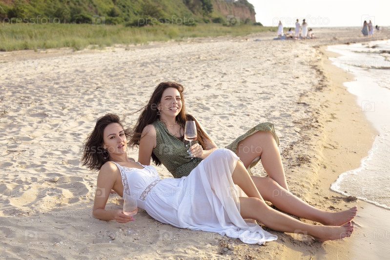 Счастливые взрослые женщины с вином отдыхают на пляже