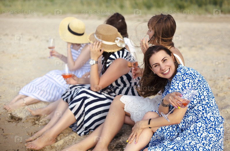 Веселые женщины предлагают тосты на пляже