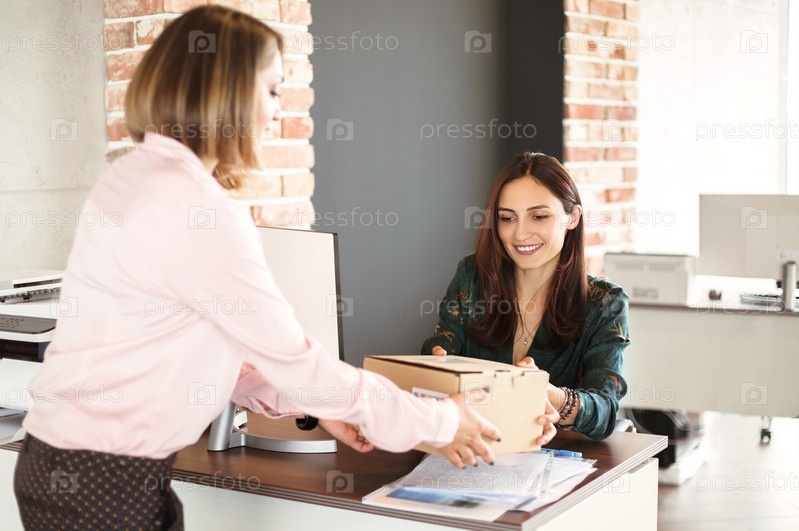 Офисный работник получает посылку от курьера