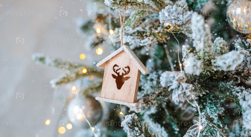 Украшенная заснеженная елка крупным планом. Деревянный игрушечный домик с подсветкой в виде гирлянды. Рождественские безделушки Фото макроса с боке. концепция зимних праздничных световых украшений. новый год 2020