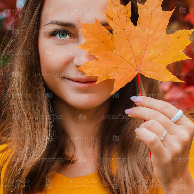 Красивая молодая женщина закрыла лицо желтым осенним листом, улыбаясь на фоне покрасневшей листвы. Осенний модный сезон. Свободное место для текста