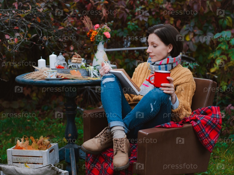 Молодая женщина в коричневом пальто сидит в кресле за столом и читает книгу с накинутым на голову пледом на открытом воздухе на фоне покрасневшей осенней листвы