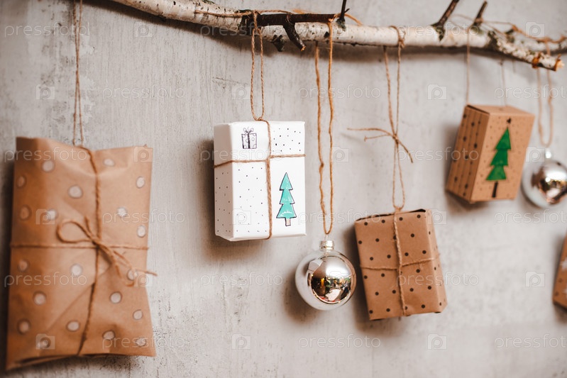 Рождественские подарки, упакованные в крафт-бумагу и украшения ручной работы, висят на веревке, привязанной к палке у серой бетонной стены