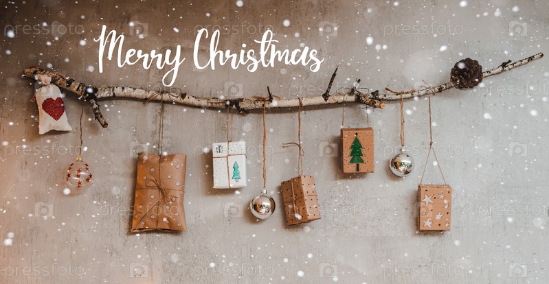 Рождественские подарки, упакованные в крафт-бумагу и украшения ручной работы, висят на веревке, привязанной к палке у серой бетонной стены