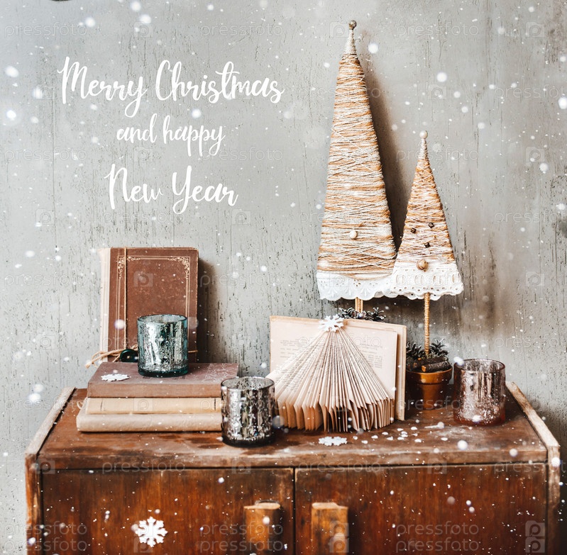 Текстильная елочка в горшке ручной работы. Бетонный серый фон. Новогодние украшения своими руками. Новогодние украшения своими руками. Свободное место для текста