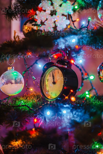 Часы висят на украшенной елке с гирляндами. Полночь нового года
