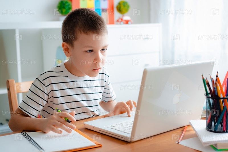 Дистанционное обучение онлайн образование. Школьник учится дома и делает домашнее задание. Домашнее дистанционное обучение