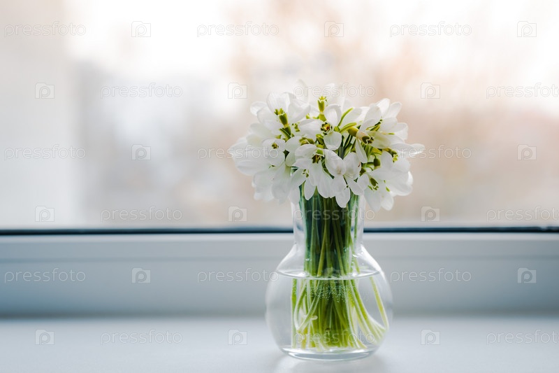 Красивый букет подснежников в стеклянной вазе возле окна на подоконнике. свободное пространство, фон. Концепция весеннего приветствия