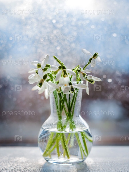 Красивые букеты подснежников в стекле в лучах весеннего солнца на подоконнике с летящими каплями воды. свободное пространство, фон с красивыми боке каплями
