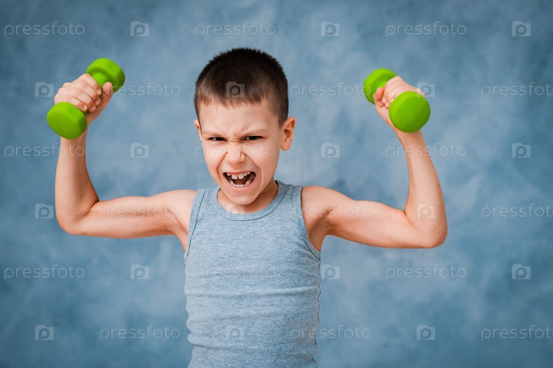 Плачущий спортивный мальчик эмоционально показывает силу мышц бицепса руки с гантелями на сером синем фоне