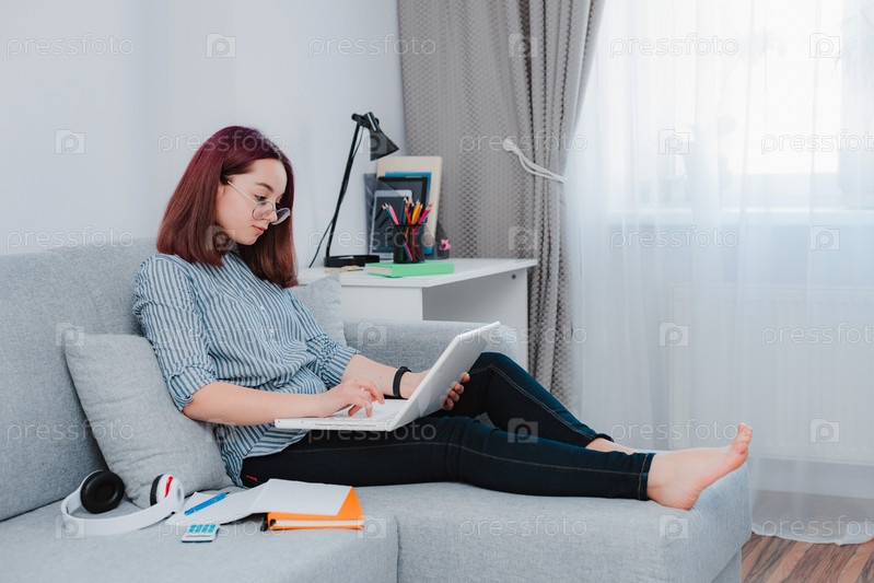 Молодая девушка школьница-подросток лежит на диване в гостиной на полу студентка учится дома, работает с ноутбуком, делает домашнее задание