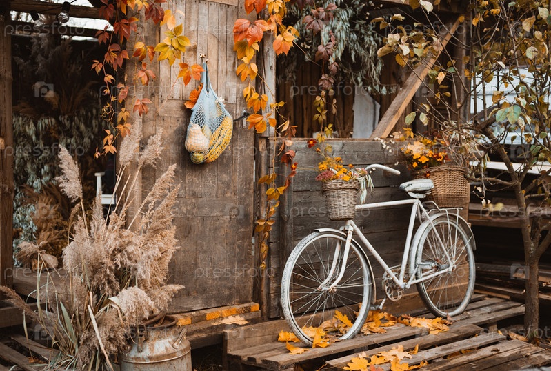 Винтажный велосипед, опирающийся на деревянную стену старого атмосферного загородного дома в прекрасный осенний день