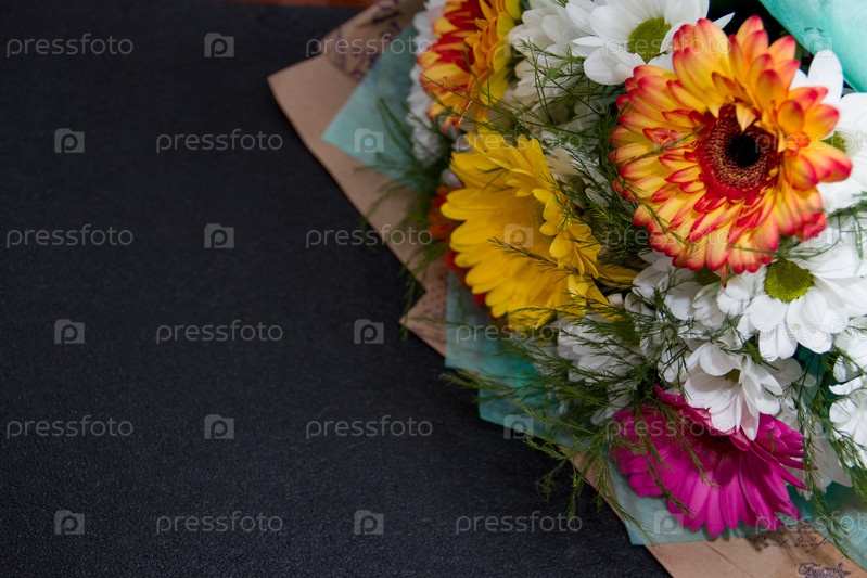 Букет гербер на черном фоне место копия желтый зеленый розовый белый оранжевый