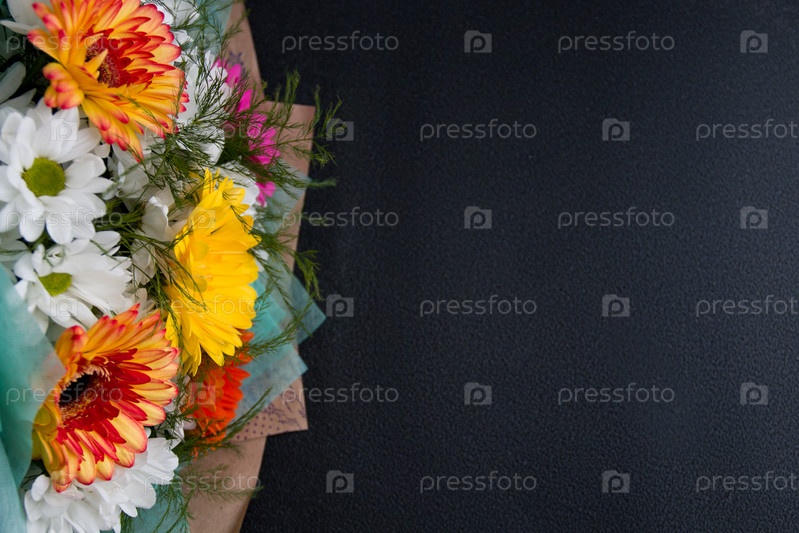 Букет гербер на черном фоне место копия желтый зеленый розовый белый оранжевый