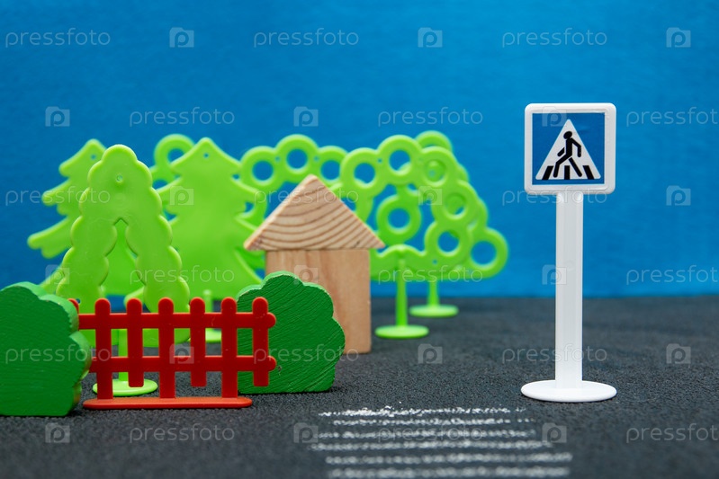 Правила дорожного движения для детей, пешеходный переход, дорожный знак и деревья за забором на черно-синем фоне