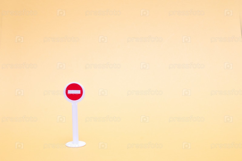 Знак остановки игрушки на желтом фоне, круглый знак на ноге, пространство для копирования, фигурка для игры