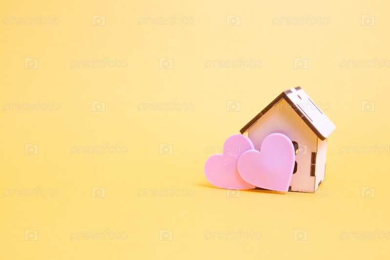 Маленькие деревянные декоративные и два розовых сердца на желтом фоне, дом для семьи, дом для влюбленных