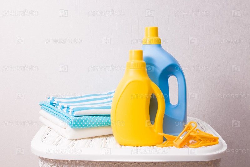 Стопка цветного белья, зажимы для сушки и гели для стирки в желтых и синих бутылках на белой пластиковой корзине для грязного белья, место для копирования