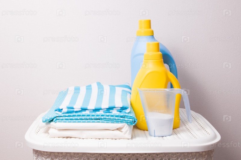 Стопка цветного белья, моющее средство в мерной чашке и гели для стирки в желтых и синих бутылках на белой пластиковой корзине для грязного белья, место для копирования
