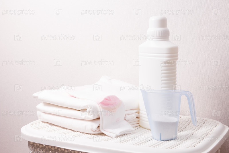 Горка белого постельного хулигана и детских носков, белая пластиковая бутылка с отбеливателем и стиральным порошком в мерном стаканчике на белой пластиковой корзине для грязного белья