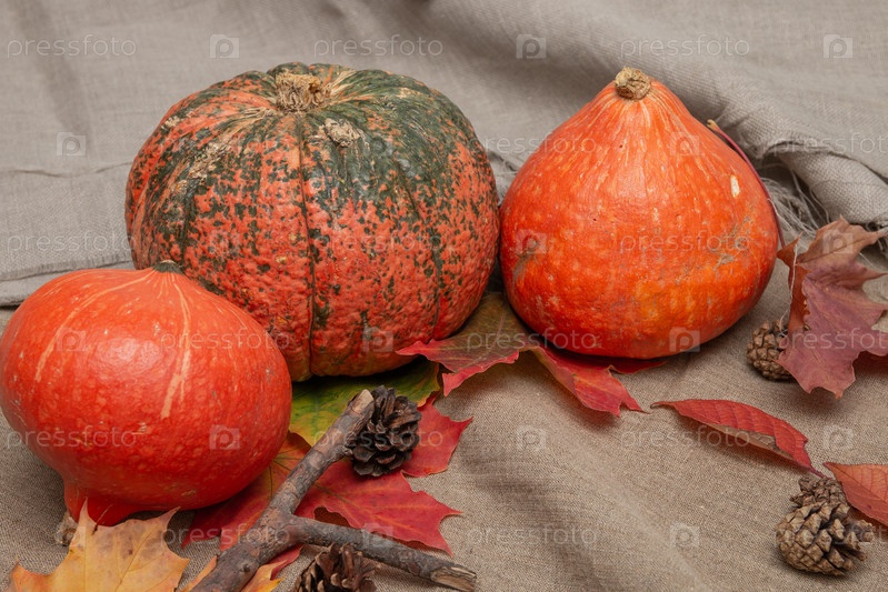 Тыквы, шишки и осенние листья на льняной ткани, текстура ткани, пространство для копирования, вид сверху, уютный натюрморт