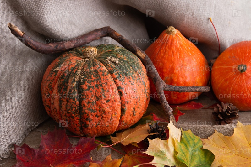 Красивые тыквы, ветка, осенние листья на льняной ткани, карская осень, фон на День Благодарения