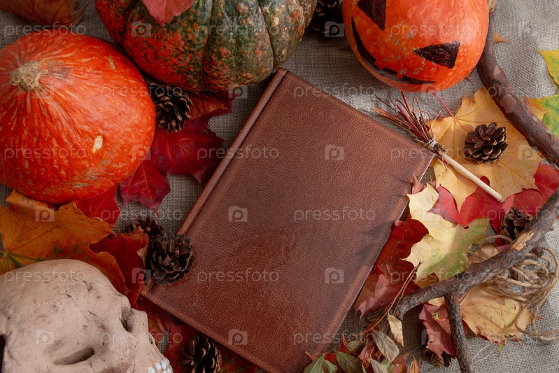Вид сверху на натюрморт с черепом, тыквами, коричневой книгой и осенними листьями, пространство для копирования, фон на Хэллоуин, оранжевые цвета. уютный натюрморт