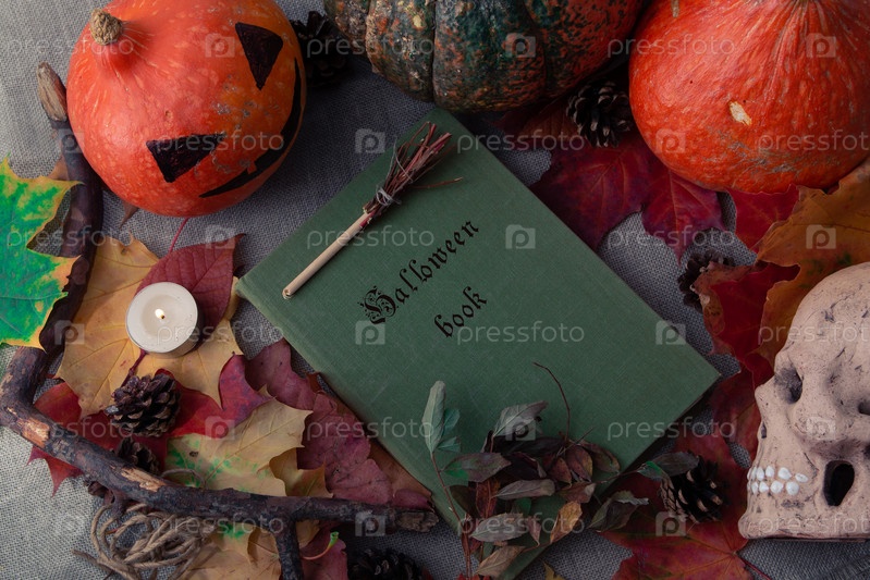 Вид сверху на натюрморт с черепом, тыквами, коричневой книгой и осенними листьями, пространство для копирования, фон на Хэллоуин, оранжевые цвета. уютный натюрморт