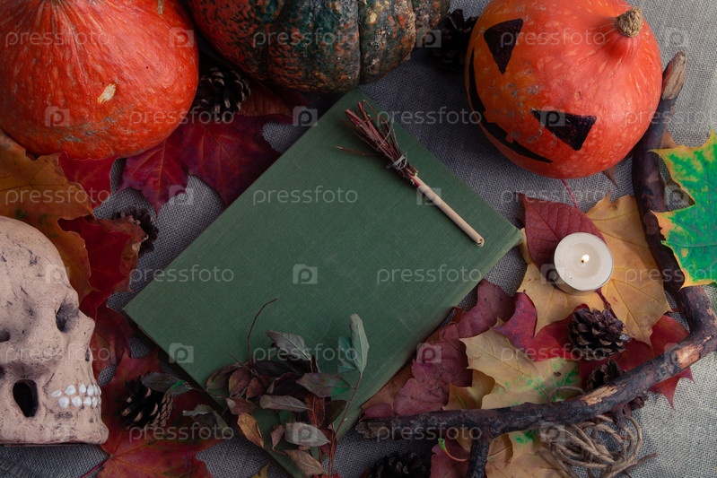 Вид сверху на натюрморт с черепом, тыквами, коричневой книгой и осенними листьями, пространство для копирования, фон на Хэллоуин, оранжевые цвета. уютный натюрморт