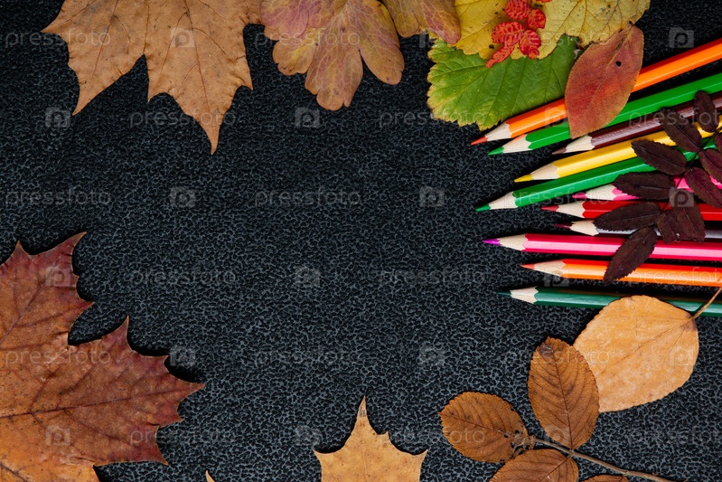 Сухие осенние желтые листья, цветные гвоздики на черном фоне место копия плоская планировка вид сверху краска осенние цвета осень
