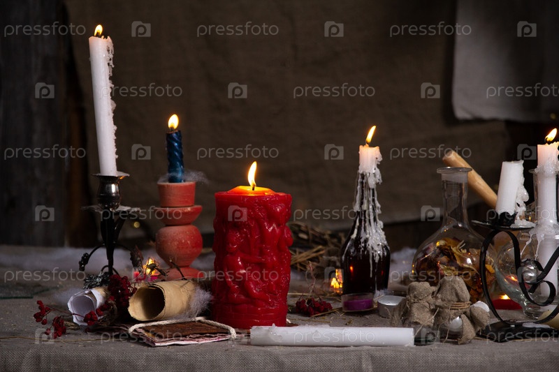 Фон хэллоуина, свечи и различная праздничная атрибутика на столе в логове ведьмы