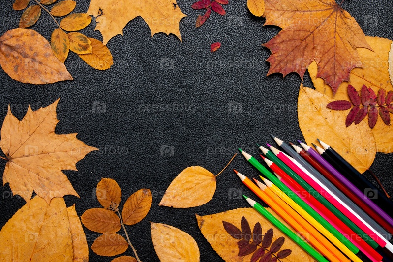Сухие осенние желтые листья, цветные гвоздики на черном фоне место копия плоская планировка вид сверху краска осенние цвета осень