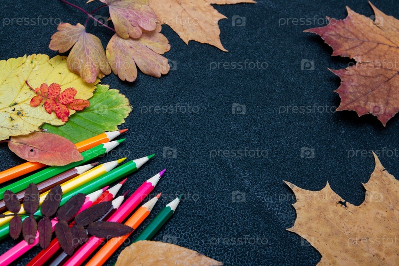 Сухие осенние желтые листья, цветные гвоздики на черном фоне место копия плоская планировка вид сверху краска осенние цвета осень