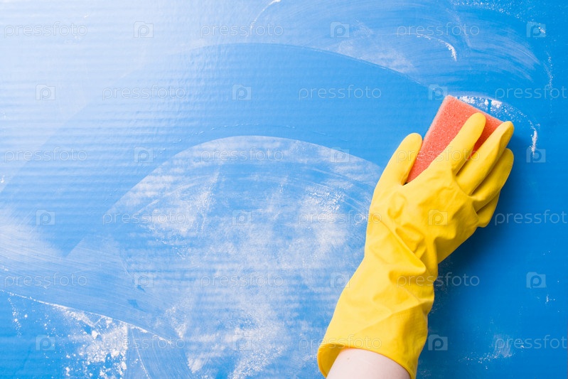 Женская рука в желтой резиновой перчатке моет синюю поверхность грязи паралоновой губкой, разбросанный белый порошок для очистки, мокрая губка оставила чистый след, очистка до и после концепции, пространство для копирования, вид сверху