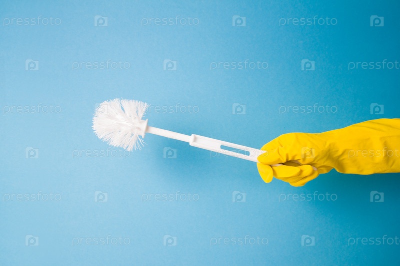 Туалетная щетка в руке на синем фоне, рука в желтой резиновой перчатке держит белую пластиковую туалетную щетку
