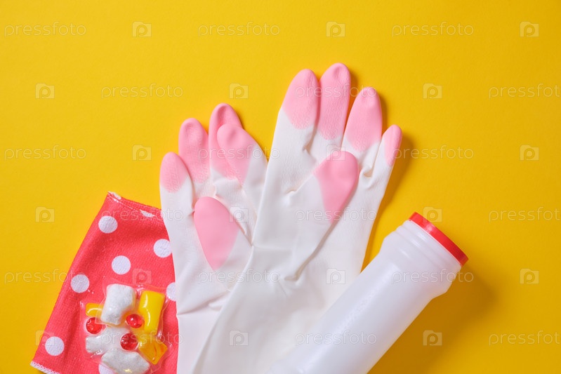 Набор чистящих средств на синем фоне. Плоская желтая тряпка и губка, резиновые перчатки, бутылка с чистящим средством, моющее средство. Уборка дома и концепция домашнего хозяйства