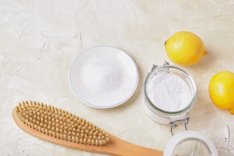 Лимонная кислота, сода, лимоны и деревянная щетка на светлом фоне для экологической очистки, натуральные и нетоксичные моющие средства, концепция образа жизни без отходов