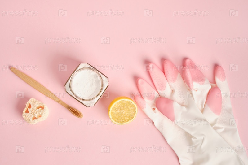 Резиновые перчатки, люфа, сода, щетка и лимон на розовом фоне, чистка нетоксичными моющими средствами, концепция образа жизни без отходов