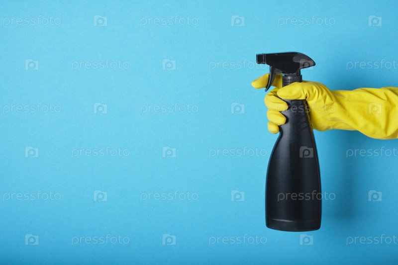 Рука в желтой перчатке держит чистящую жидкость на синем фоне