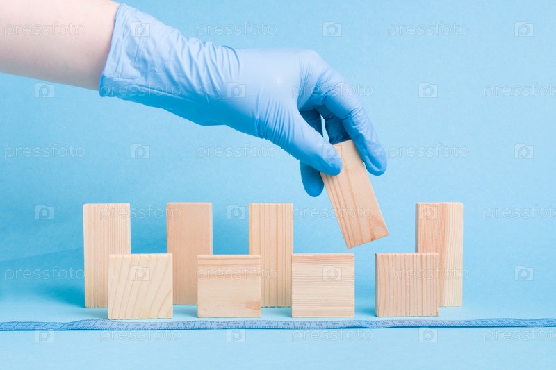 Рука в резиновой одноразовой синей медицинской перчатке берет блок домино, домино выстроены в ряд, синий фон, пространство для копирования, концепция социальной дистанции, изоляция больного человека от общества
