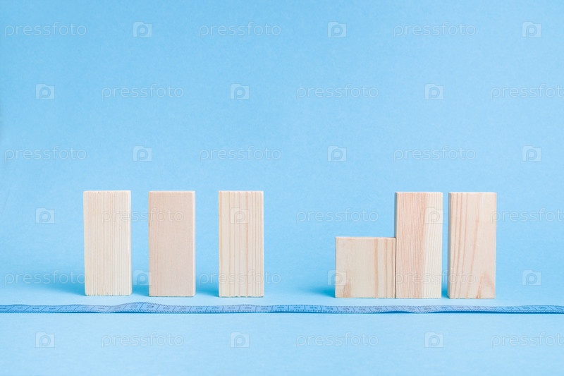 Деревянные домино и квадраты стоят в ряд на синем фоне, пространство для копирования, концепция социальной дистанции, семейная самоизоляция в период карантина, метровая синяя лента для измерения