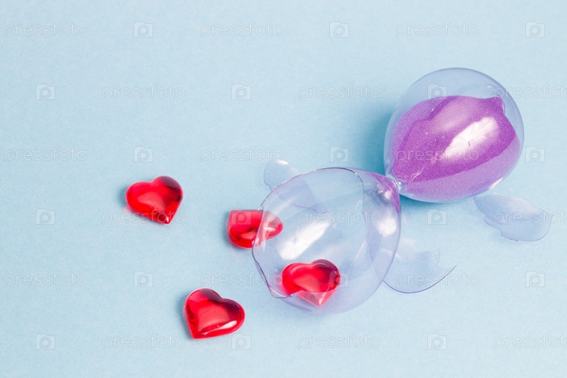 Стеклянные разбитые песочные часы с фиолетовым песком и маленькие красные стеклянные сердечки лежат на синем фоне, концепция разбитого сердца, несчастная любовь и разрыв, осколки стекла, пространство для копирования